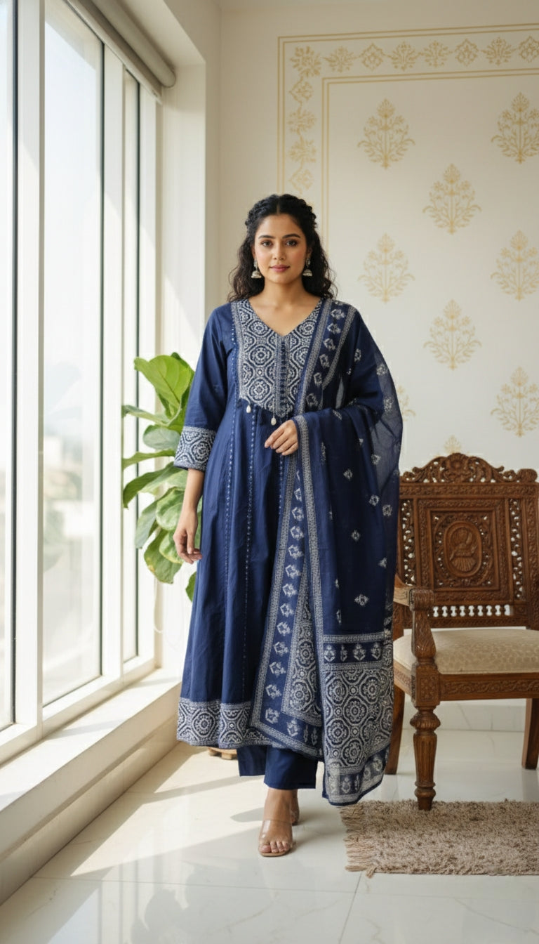 Women Navy Blue Kalamakari Printed Work Cotton Kurta Pant Dupatta Set